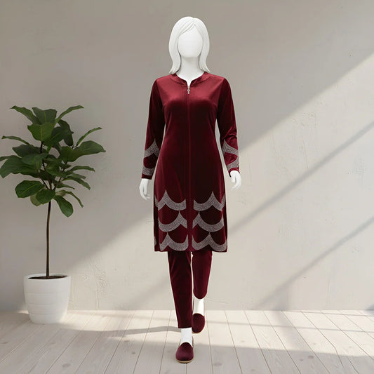 Maroon - Velvet Co-Ord Set with Stone Detailing
