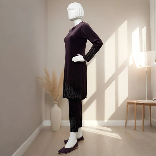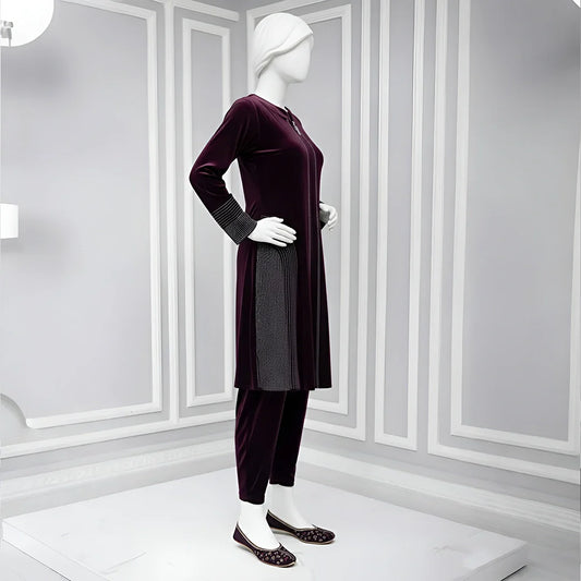 Wine - Attractive Stone Work Velvet Co-Ord Set