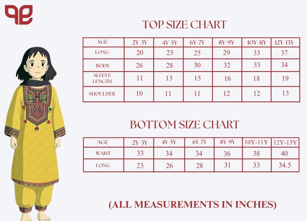 4/5 Years: Long-23, Body-28, Sleeve-13 inch.