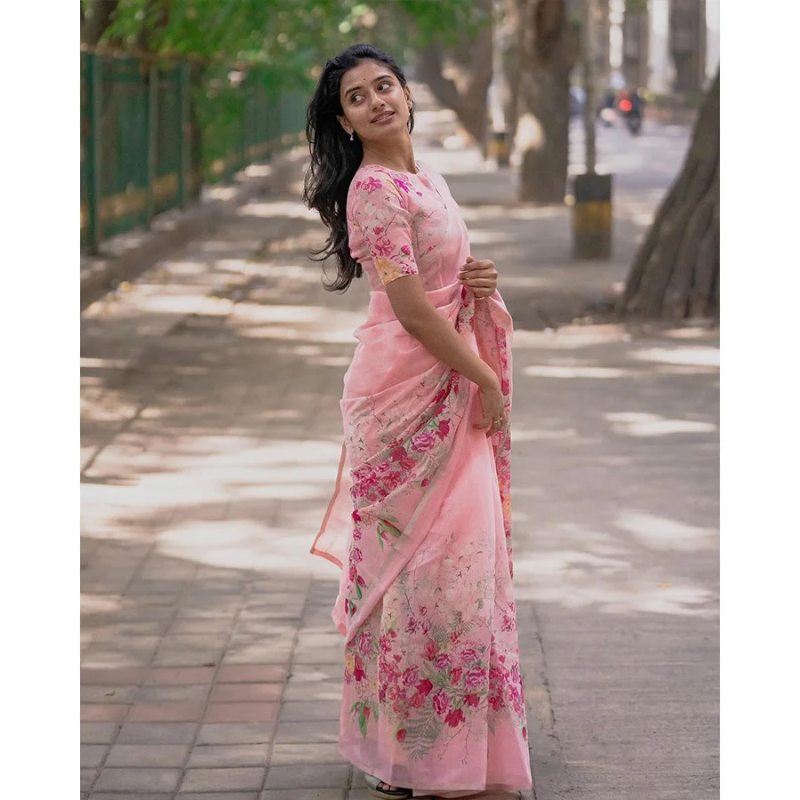 Exquisite Floral Printed Pink Sharee