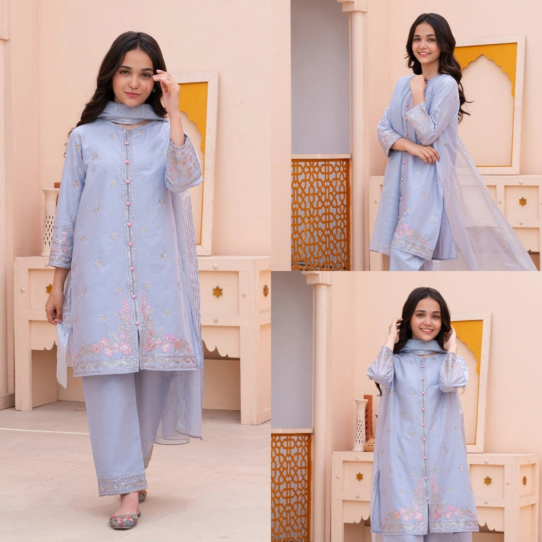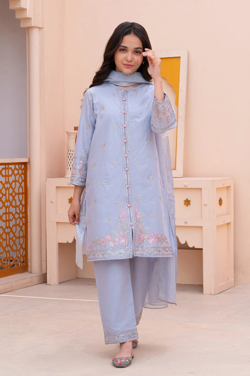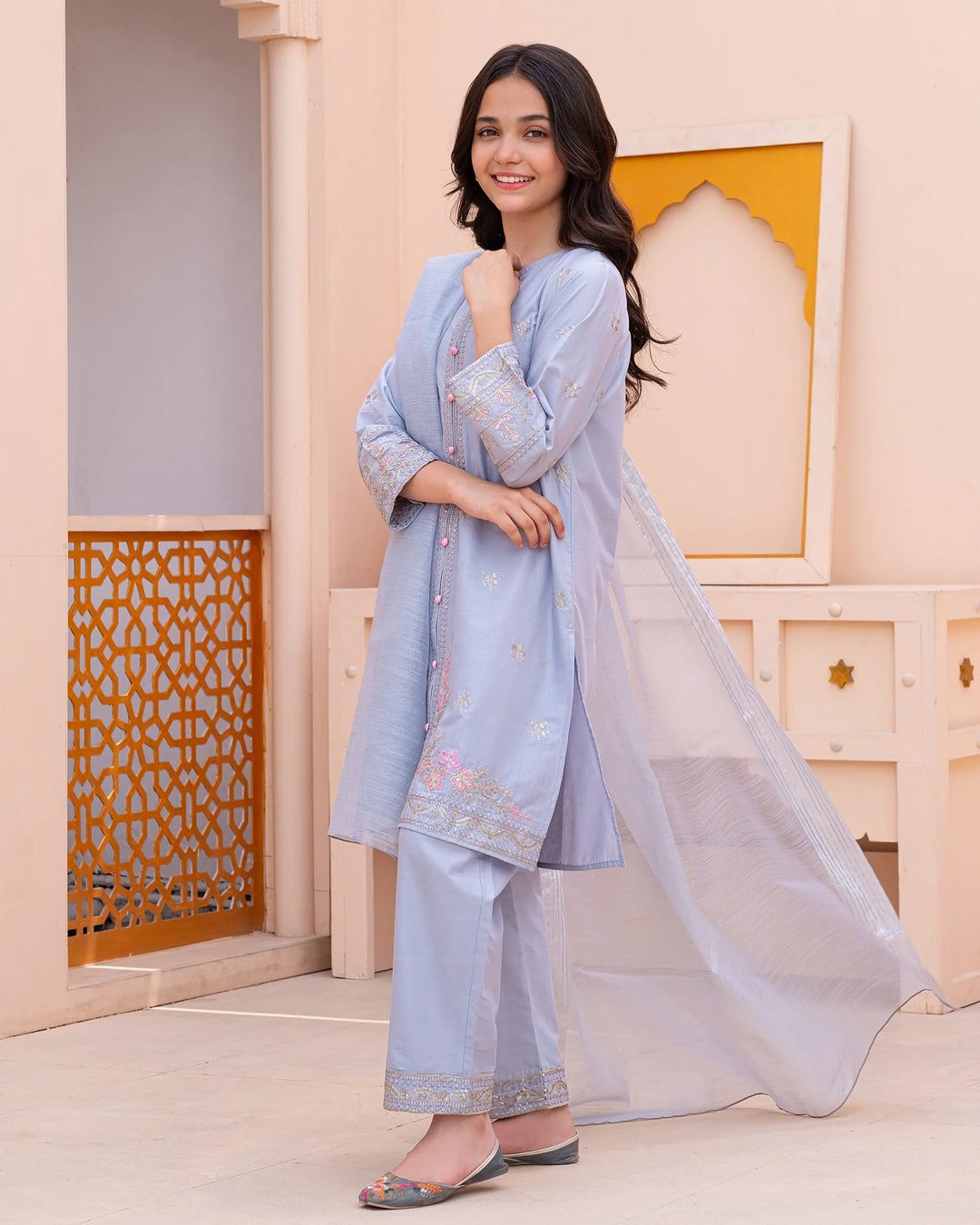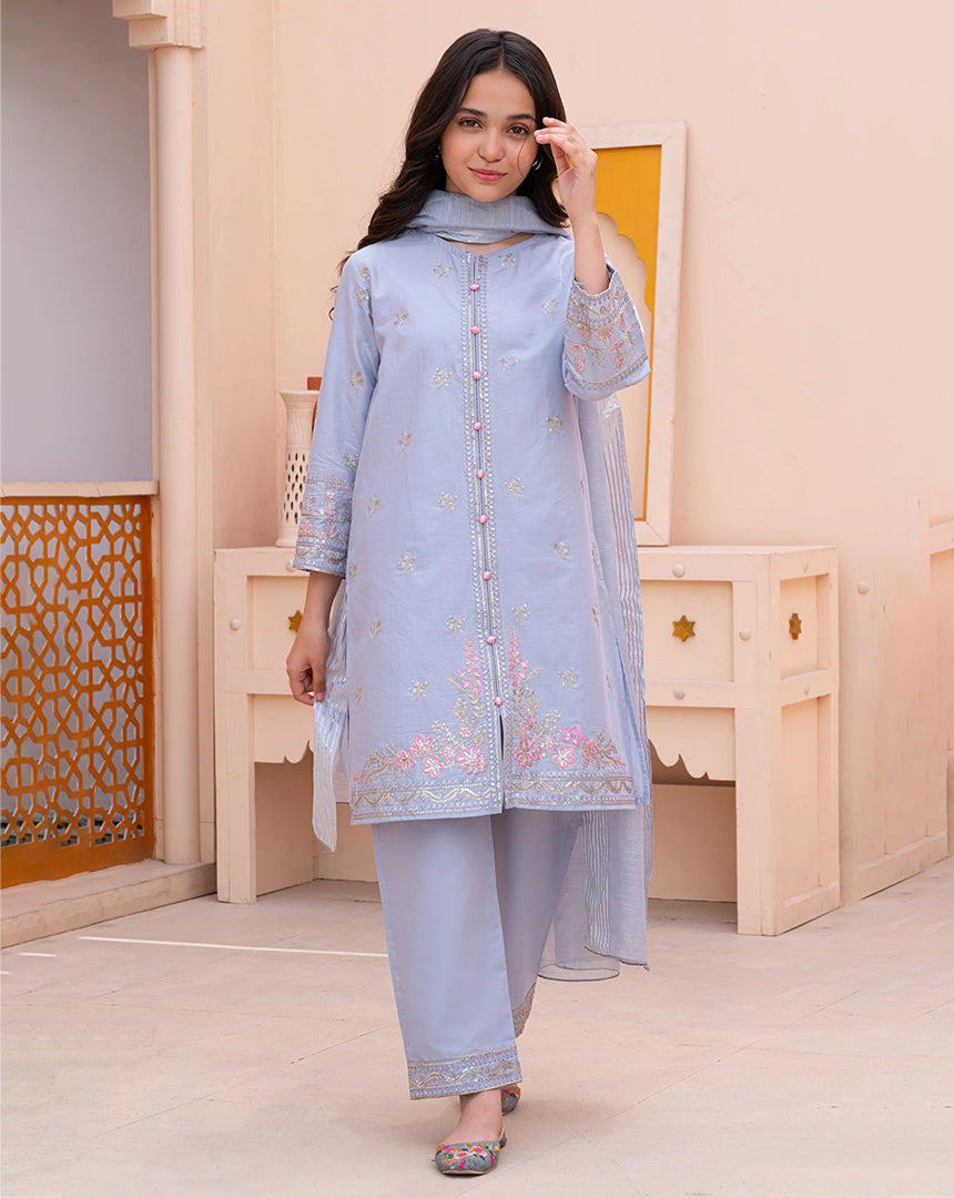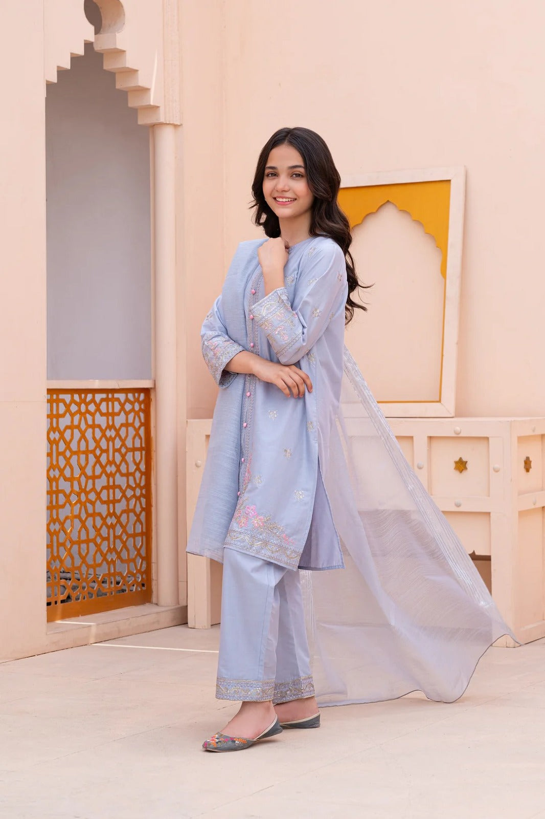 Give your child a beautiful festive look with our Lilac sequin embroidery kidsโ suit. This outfit is made from soft, breathable cotton, ensuring your little one stays comfortable throughout the day. The pant is also made from the same premium cotton, providing a smooth and easy fit.ย