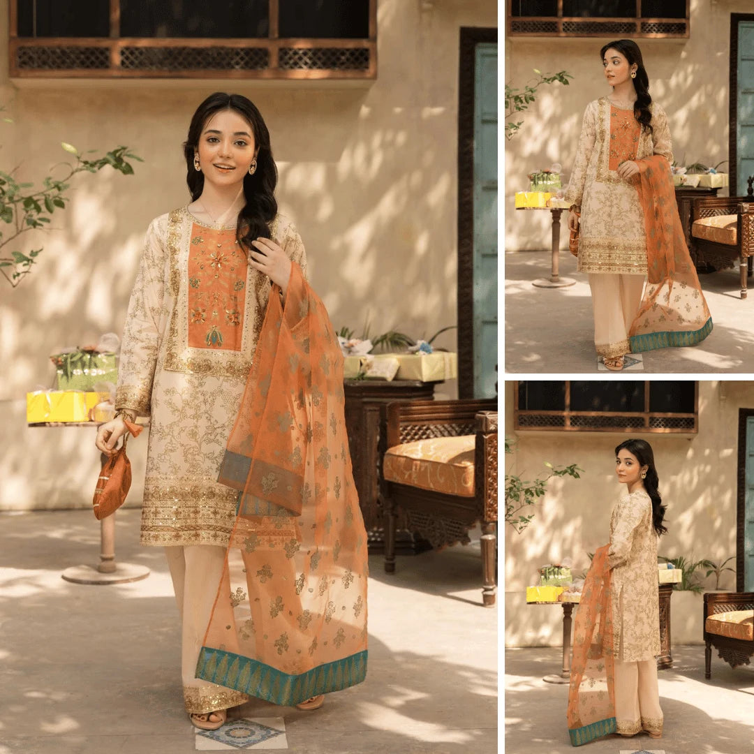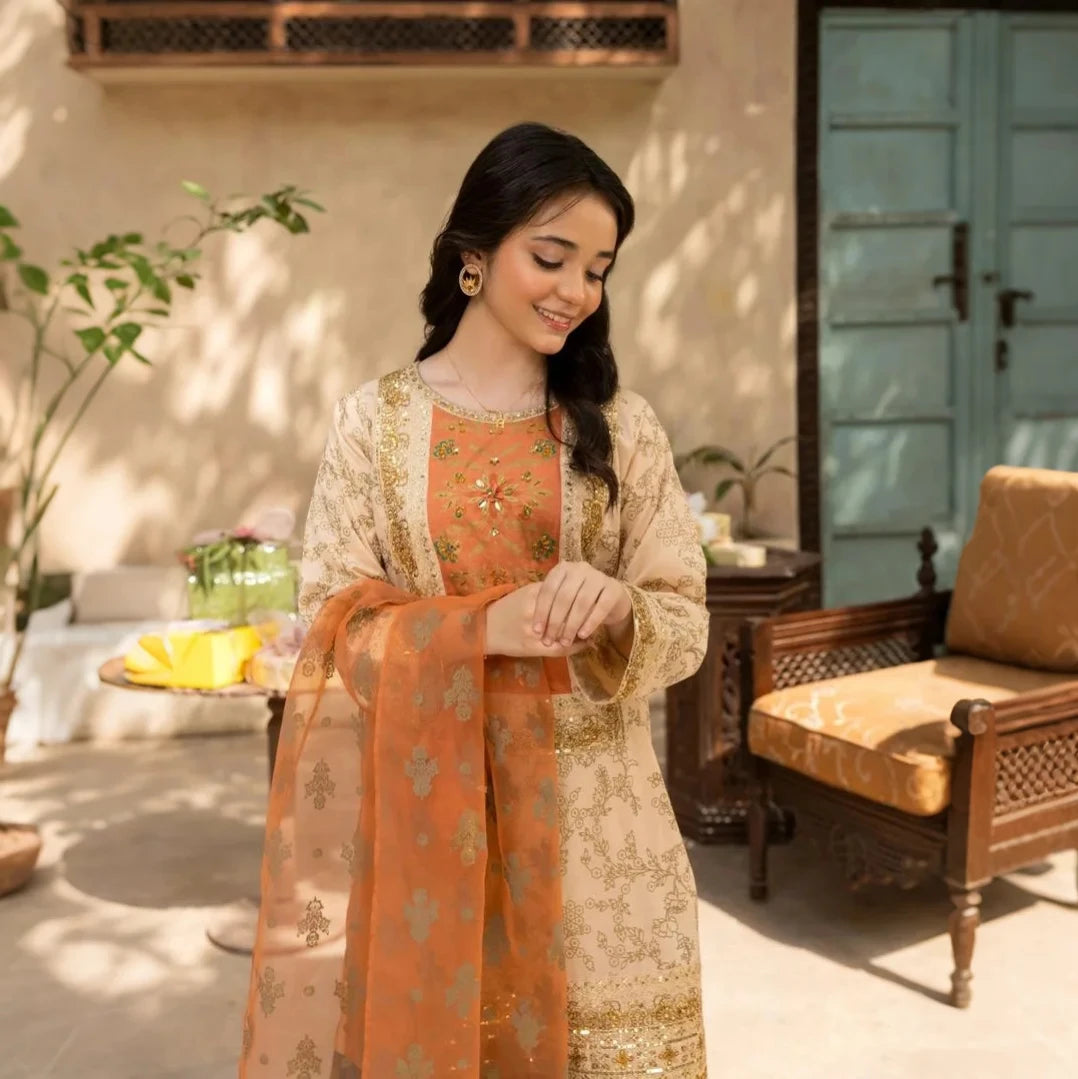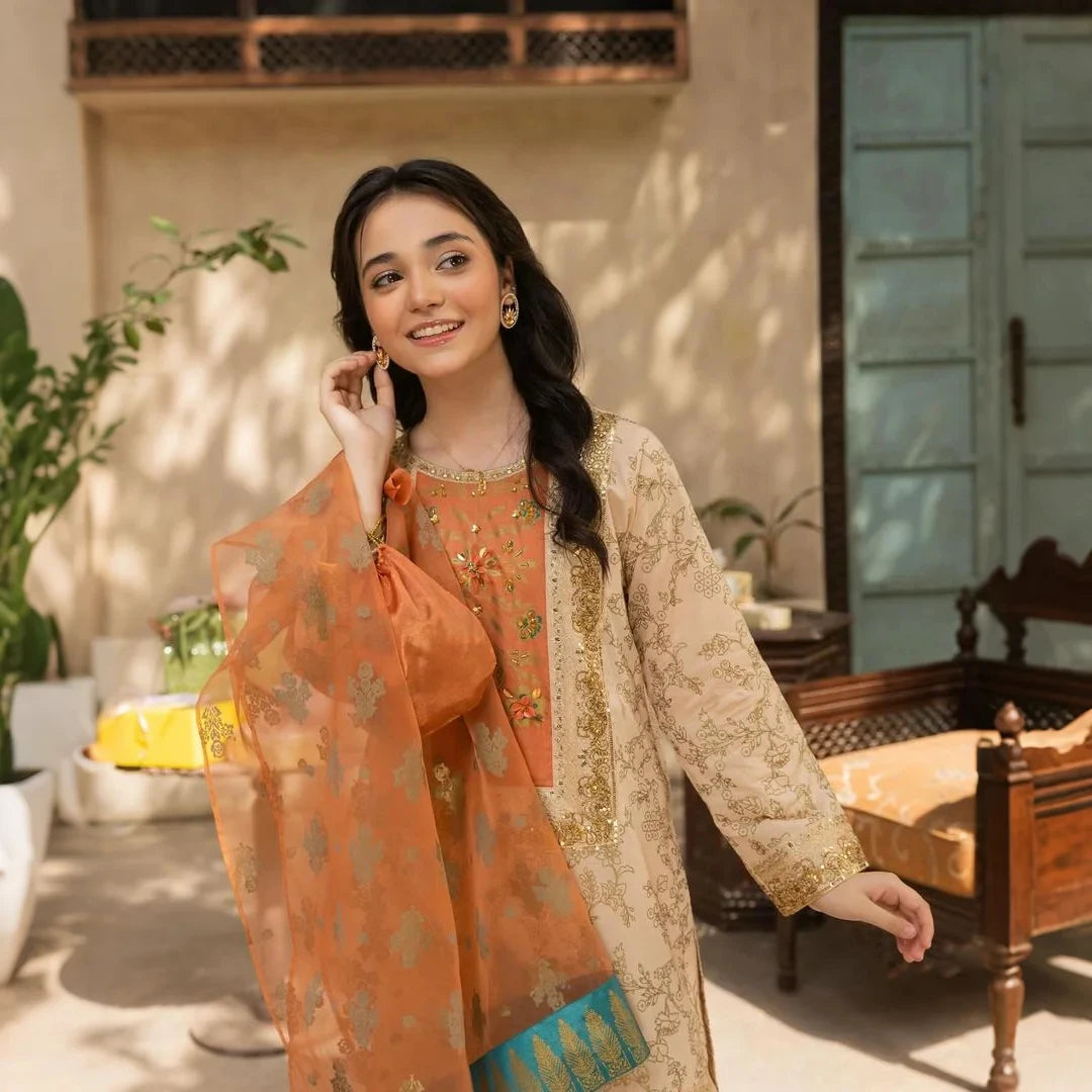 - Organza dupatta with screen-print work – graceful & airy finish.