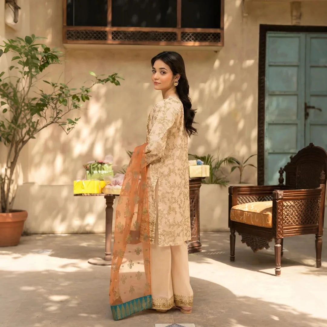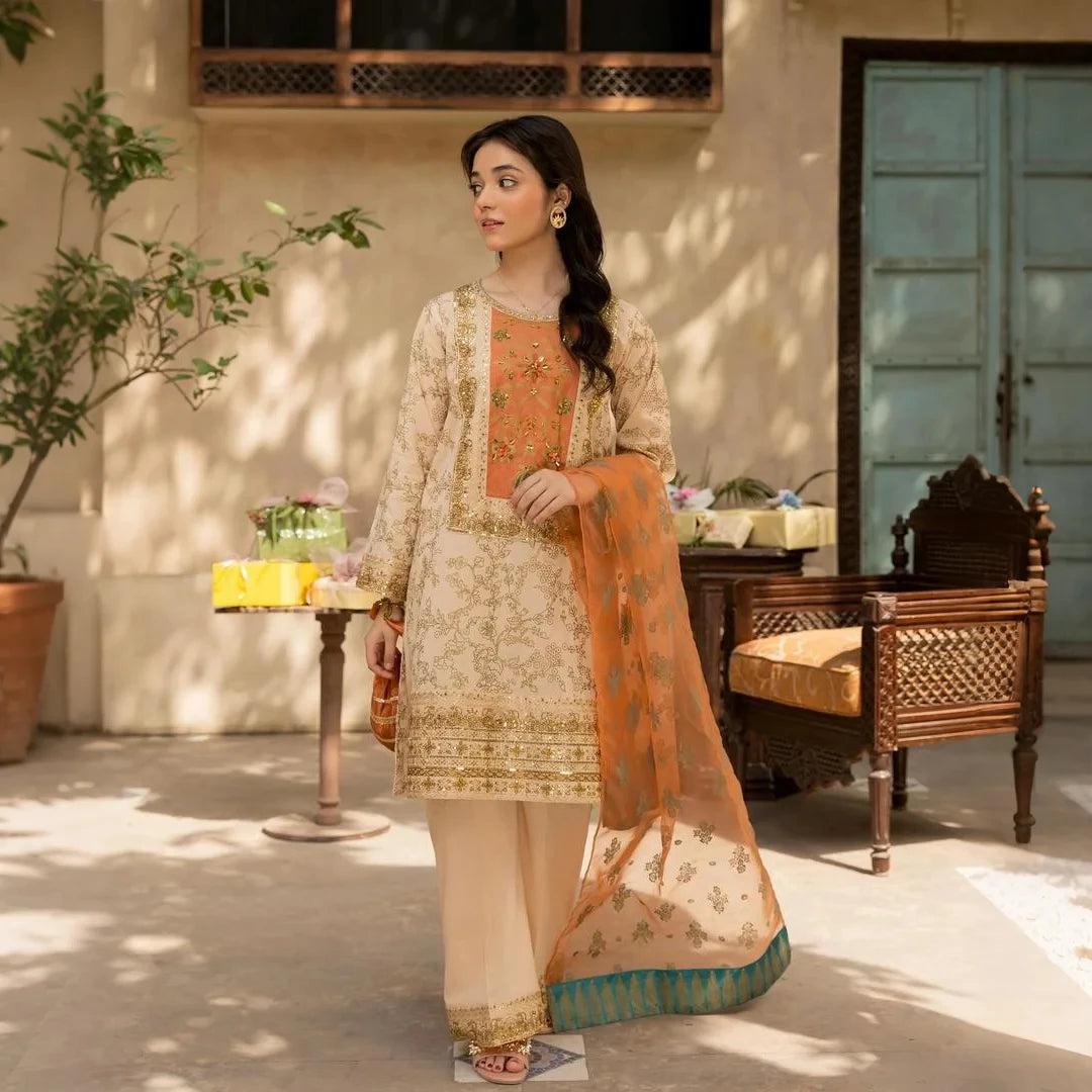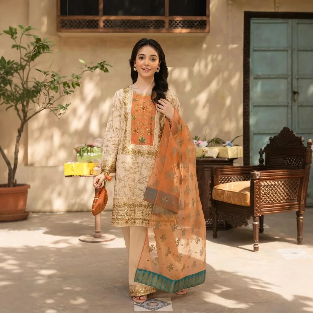 - Organza dupatta with screen-print work – graceful & airy finish.