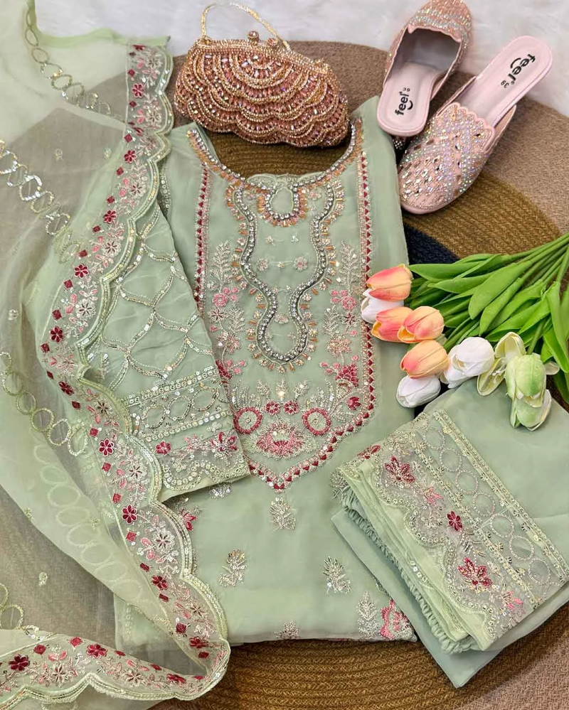 The matching organza dupatta is also fully embroidered and decorated with sequins, completing the graceful design. The pants are made from santoon cotton, which is soft and breathable, making it easy to wear all day.