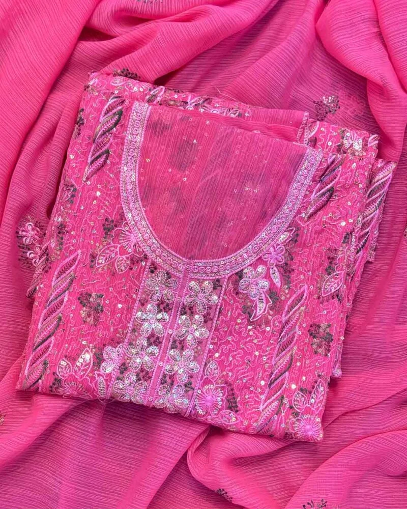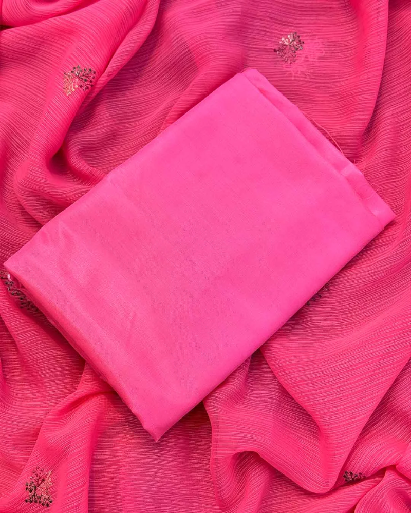 Add a touch of timeless elegance to your wardrobe with our unstitched diamond georgette three-piece set, featuring a beautifully flowing dress and matching orna. The soft, lightweight texture of diamond georgette makes it perfect for festive occasions, celebrations, or special gatherings. Paired with a comfortable Santoon fabric pant, this set offers the ideal blend of style and ease.