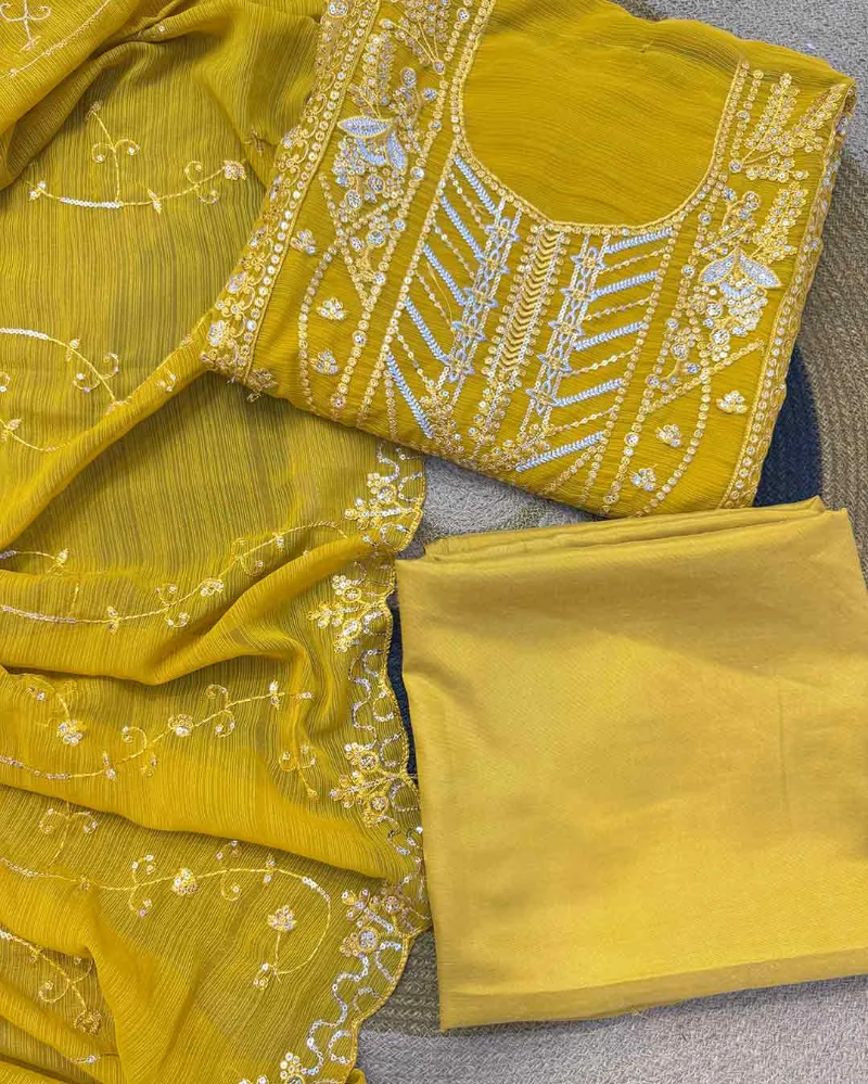 Add a touch of timeless elegance to your wardrobe with our unstitched diamond georgette three-piece set, featuring a beautifully flowing dress and matching orna. The soft, lightweight texture of diamond georgette makes it perfect for festive occasions, celebrations, or special gatherings. Paired with a comfortable Santoon fabric pant, this set offers the ideal blend of style and ease.